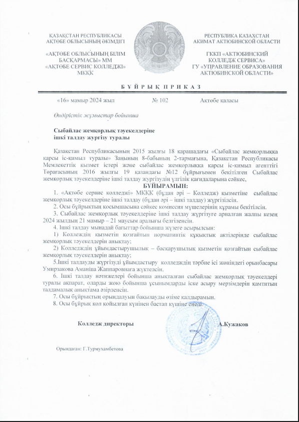 Қазақстан Республикасының 2015 жылғы 18 қарашадағы «Сыбайлас жемқорлыққа қарсы іс-қимыл туралы» Заңының 8-бабының 2-тармағына, Қазақстан Республикасы Мемлекеттік қызмет істері және сыбайлас жемқорлыққа қарсы іс-қимыл агенттігі Төрағасының 2016 жылғы 19 қарашадағы №12 бұйрығымен бекітілген Сыбайлас жемқорлық тәуекелдеріне ішкі талдау жүргізудің үлгілік қағидаларына сәйкес, «Ақтөбе сервис колледжі» МКҚК (бұдан әрі – Колледж) қызметіне сыбайлас жемқорлық тәуекелдеріне ішкі талдау (бұдан әрі – ішкі талдау) жүргізіледі. Сыбайлас жемқорлық тәуекелдеріне ішкі талдау жүргізуге арналған жалпы кезең 2024 жылдың 21 мамырынан 21 маусым аралығына белгіленсін.
